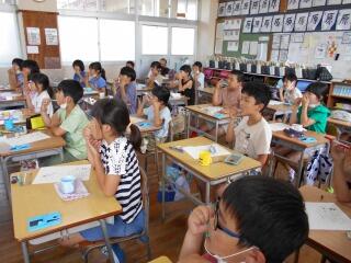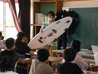 まず2時間目は、サーフショップ経営の伊久良さんを講師に、サーフィンの魅力について話をしていただきました。子どもたちからは、「一番難しい技は何ですか?」や「サーフィンの楽しいのはどんなところですか?」など、様々な質問が出されました。