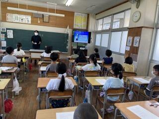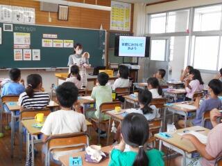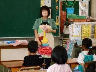 6月26日の3時間目に、1年生が食育の授業を行いました。塩見小学校の栄養教諭の先生に来ていただいての授業でした。