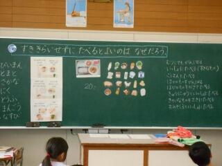 この時間は「好き嫌いせずに食べるとよいのは、なぜだろう」というめあてで授業が行われ、「野菜は腸の掃除をする」ことなどを学びました。