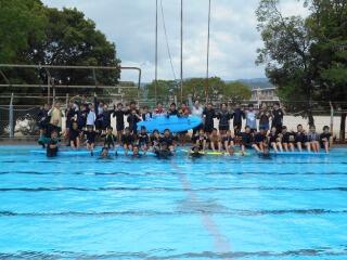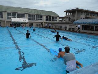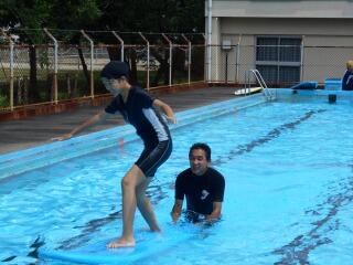 そして、3・4時間目は、プールでサーフィン体験をしました。日向市サーフィン連盟の方々の協力により、パドリングから始まり、ボードに立つ練習、パドリングからボードに立つ練習と、段階的に練習をしていきました。子どもたちは、上達が早く、すぐにできるようになっていました。