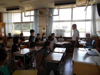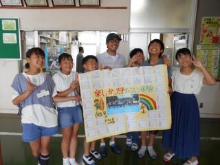 「サーフィン体験」でお世話になった伊久良さんが7月14日に来校され、お礼の言葉を書いてまとめた模造紙を、6年生の代表が渡しました。
