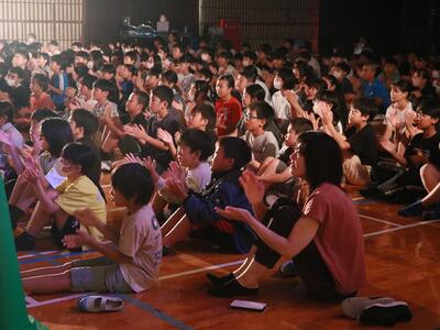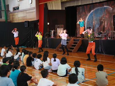 劇団「影法師」による鑑賞教室が開催されました。SDGsの視点が含まれた「もったいない」ということについて、歌と踊りが入った素晴らしい脚本でした。ミュージカルの後は、ワークショップがあり、劇団の方々と一緒に体を動かしました。とても素敵な笑顔で楽しく踊っていました。