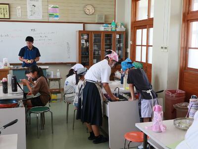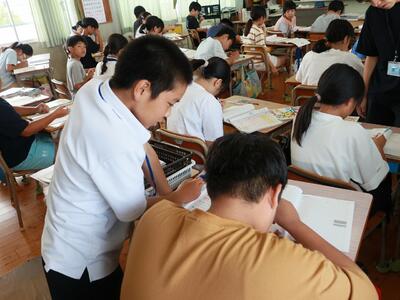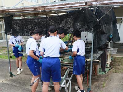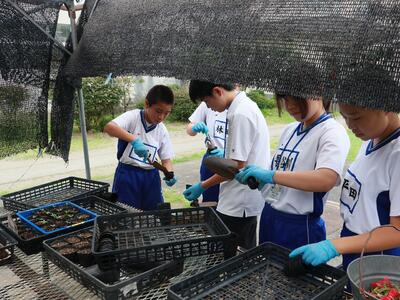 2日目は、授業だけではなく、学校の様々な役割を体験する一日となりました。技術員補助の橋本恵さんが、夏の花壇に向けて6月上旬に播種をしたものを、ポットに移植する作業のお手伝いをしてくれました。学校の環境を整える大切な仕事の一つです。中学生が植え替えた花が、美しい学校の実現につながります。咲き誇るころには見に来てほしいものです。
