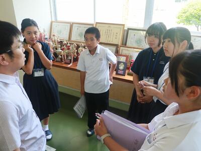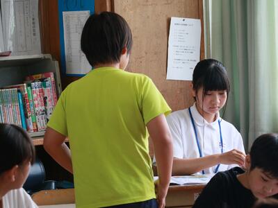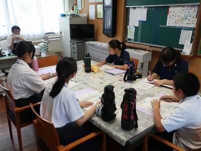 財光寺中学校2年生による職場体験学習「14歳のよのなか挑戦」で6名の生徒が来校しました。玄関で揃っての挨拶は、緊張感の中にも、とても元気がよく、張り切っている様子が伺えました。柴田教諭の指示のもと準備を整え、馬場校長からのお話の後、早速、5・6年教室に一人ずつ入り担任の指示のもと、先生の補助者として授業のお手伝いをしていました。児童が下校後は、控室の図書室和室でしっかり記録を書いていました。この日は、第1回学校運営協議会が14時よりあったことから、委員の皆さんとも意見交換をする時間もありました。