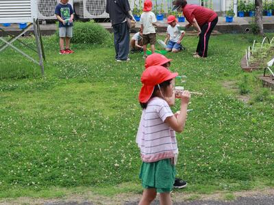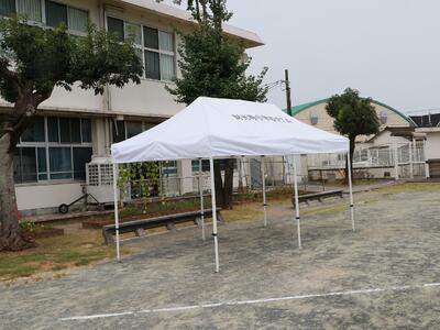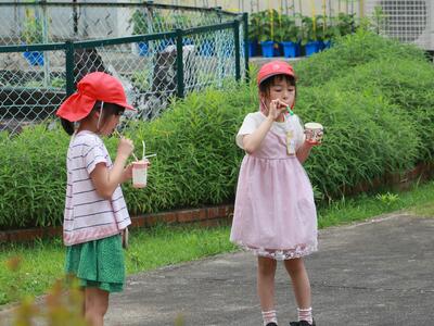 中庭にシャボン玉の花がたくさん飛んでいました。1年生が、生活科の学習の1つである「昔の遊び」体験のための学習で、シャボン玉を飛ばしていました。ふつうのタイプもありましたが、団扇を使ったものにもチャレンジしていて、子どもたちの笑顔であふれていました。