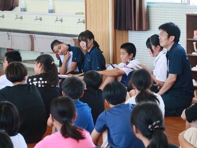 3日間の体験の最終日となりました。1~3時間目は学級に入り、学習のお手伝いをしました。4時間目は、校長先生より「学校経営」「給食の検食とは」「働くとは」などお話をお聞きしました。一生懸命メモを取る姿はとても素晴らしかったです。その後、教頭先生に6つの質問でのインタビューがありました。「今、何を学べばよいか」「仕事とプライベートは分けられる?」など未来の自分を見つめる、切り拓くための気持ちが伝わってきました。5時間目は、6年生に向けてのメッセージを発表する時間でした。自信のある気持ちの伝わる発表でした。また6年生の質問に対しても、相手に体をきちんと向け、語り掛ける姿はとても素晴らしかったです。3日間、お疲れ様でした。