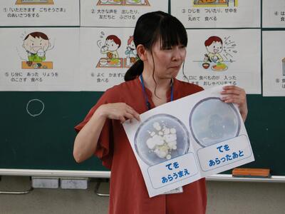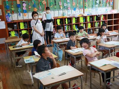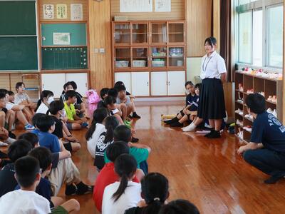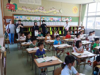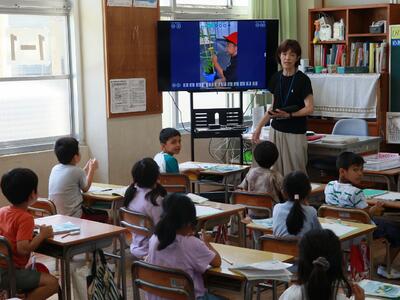 1年生と園児の交流会がありました。最初は、教室での授業の見学をしました。その後、体育館で交流会がありました。1年生は、とても授業に集中していて、とても張り切っていました。園の先生方から「成長していますね~」と感想をいただきました。