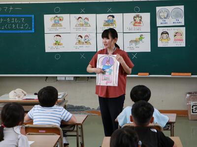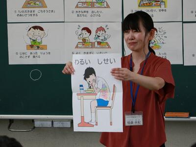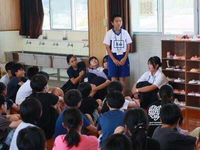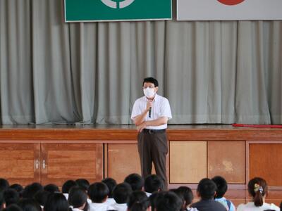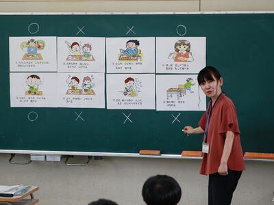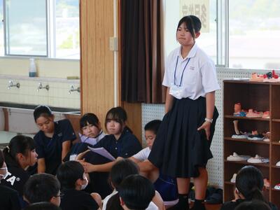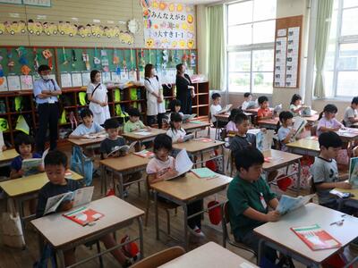 日向警察署の方をお迎えして各学級ごとに「万引き」ということについて考えました。挿絵を使い、実際にお店の中で友達に誘われて万引きをしてしまう場面をみて話し合いました。考えた後に、警察の方とどんな風に言えば断れるのか、止めることができるのか、自分の言葉で伝える練習をしました。一生懸命考えて、行動をする力を学びました。