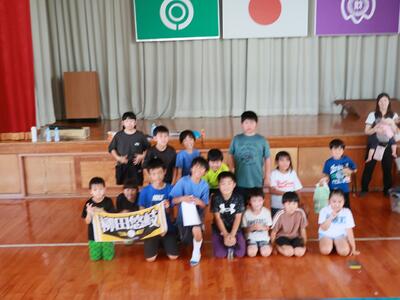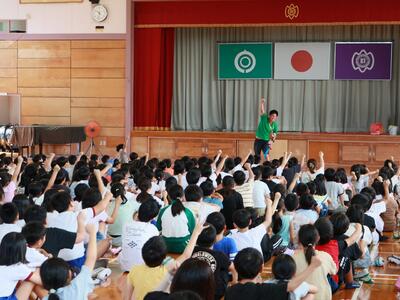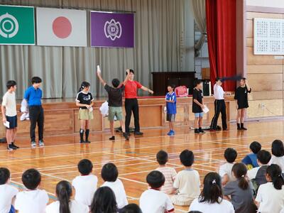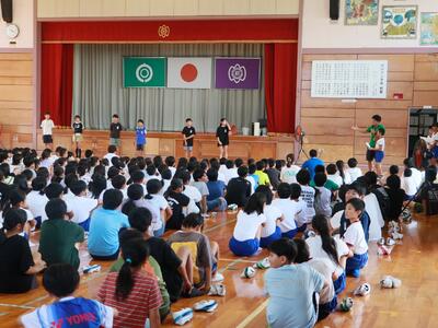 㐂財(きさい)丑寅会の皆さんが、昨日までの疲れも見せず、子どもたちのために「ひょっとこ奉納」がありました。昨日までの祭りの疲れも残っておられる中でしたが、子どもたちのために舞を披露してくれました。6年生も練習の成果があり、上手に舞うことができました。獅子舞もあり、全校で心身の健康を祈りました。tokoとこ事業所から4名の皆さんも見学に来てくださいました。大変盛り上がりました。