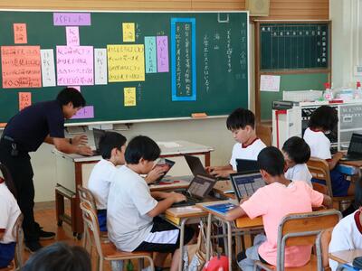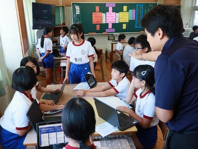 2年2組担任の來須教諭の初期研1年目として初めての研究授業が行われました。放課後も板書計画を考えたり、先輩方と話し合ったりと準備を進めてきました。今後も研究授業が計画されています。本日は、「100をこえる数」の9時間目。10を単位とした数の相対的な思考から加減法を行う学習でした。子どもたちは、タブレットやノートを活用しながら、デジタルでの具体物を手で操作しながら、よりよい解き方を考えていました。