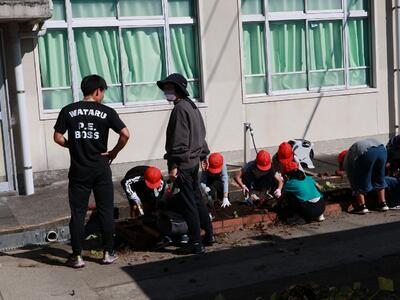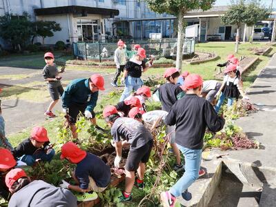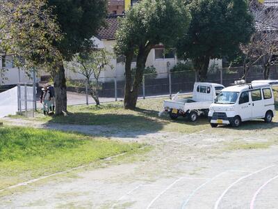 先日、教育総務課の方から奉仕作業の日程について問い合わせがありお伝えしていたところ、昨日の午後に教育総務課の技術員さんが「運動場の草の状況を見に来ました。」と来られました。夏の暑い1週間、作業をしていただいたこともあり、「学校でしますから大丈夫です。」とお話ししていたのですが、本日、朝の内に4名の技術員さんが来られ、運動場の東側、南側の除草作業をしていただきました。感謝です。