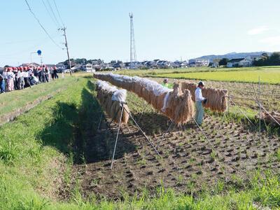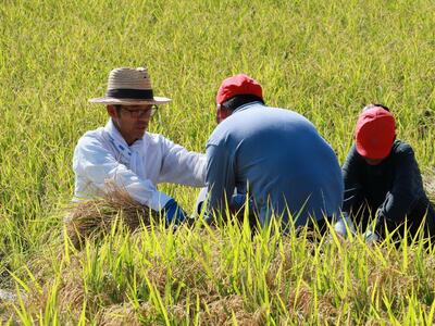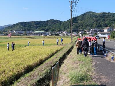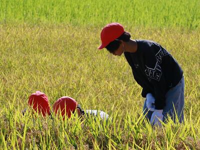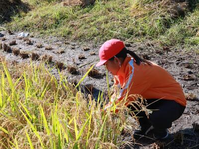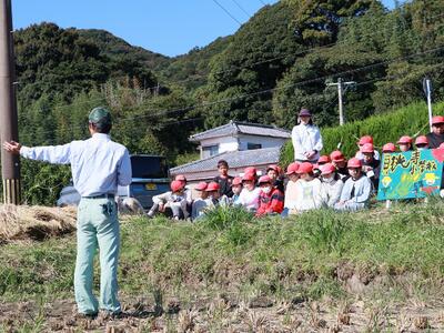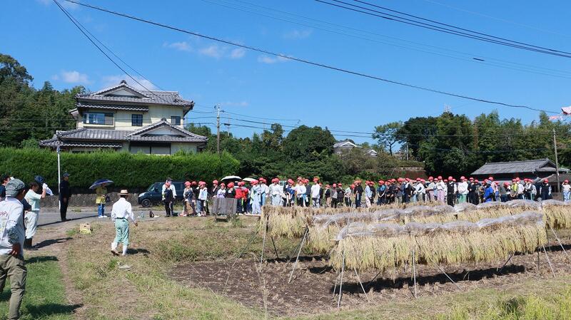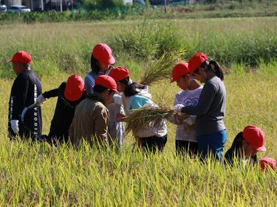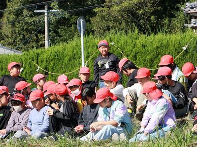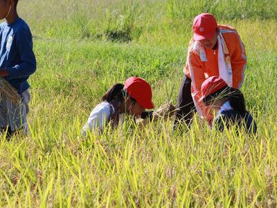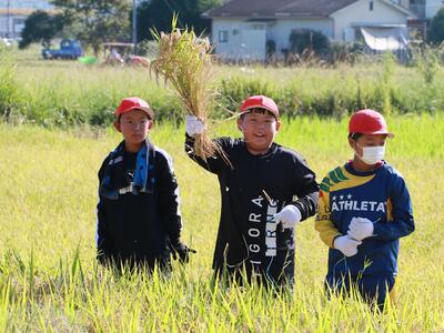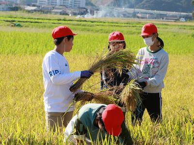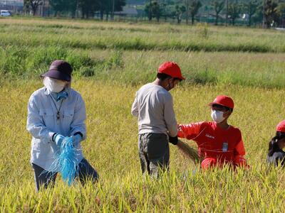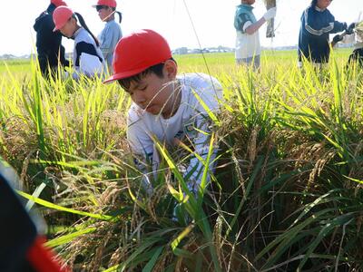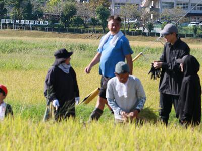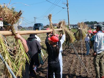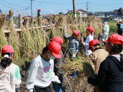 5年生の総合的な学習の時間で「稲刈り」がありました。秋晴れというよりも夏が戻ったかのような暑さで、子どもたちも少し疲れ気味ではありましたが、3人組をつくり、鎌で刈る→束にする→紐でまとめるという作業を交代しながら行いました。最後のかけ干し作業までしっかり取り組みました。次回は脱穀作業です。