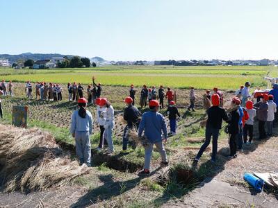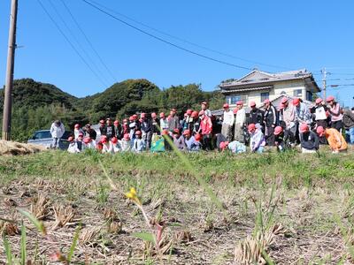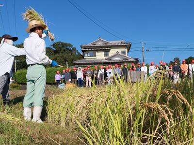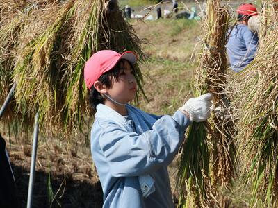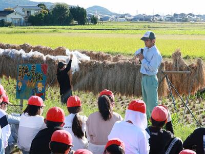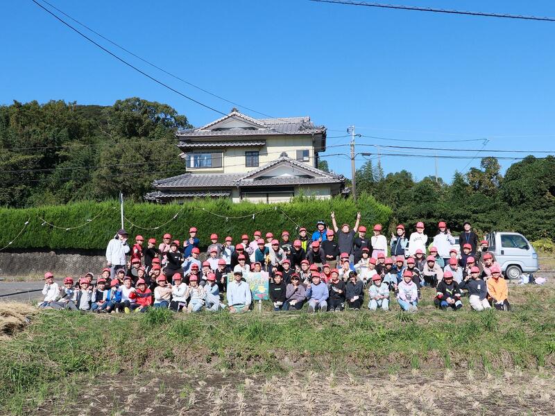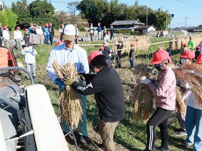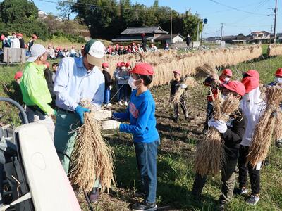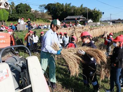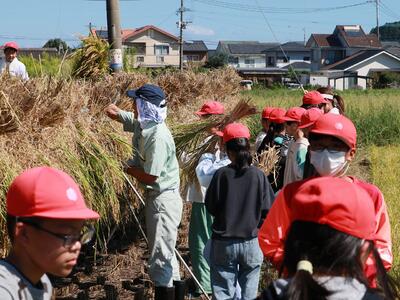 5年生は、先日稲刈りを行い、かけ干しをしていた稲の脱穀作業を行いました。最高の秋晴れの中での作業となりました。治田健吾さんから作業の方法を教えていただき、小川先生からは、五感を働かせた作業をすることが指導されました。かけていた稲の束をもち、機械にかけていきます。併せてかけていた竿なども片付けながら、全員が体験しながら進めました。見ていても本当に主体的に「よく動く」5年生に感動でした。今年が現場での稲作りが最後になります。お世話いただいた皆様には本当に感謝しかありません。治田さんが最後におっしゃいました。「ありがとうという感謝の気持ちをもった財っ子であってほしい。」子どもたちの学びは、知識だけでなく、この風土の中で息づく人間関係づくりであることを改めて感じた時間となりました。