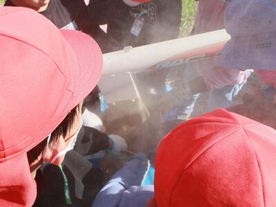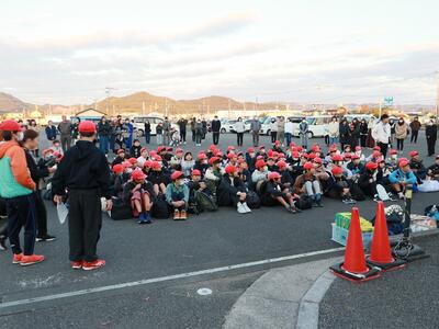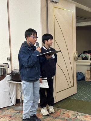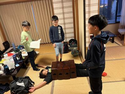 お迎えに来てくれた子どもたちが、プラカードを持って出迎えてくれました。財っ子のつながり、優しさ、思いやりを感じた瞬間でした。
