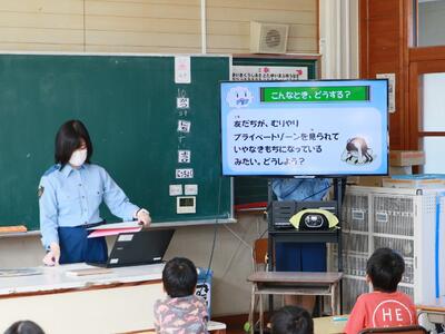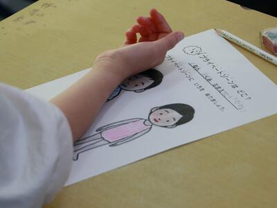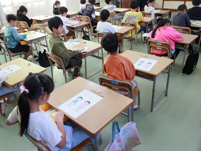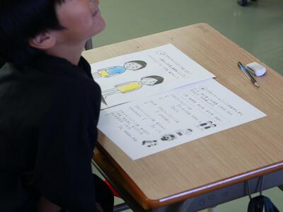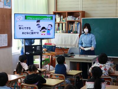 日向警察署の指導員の方にきていただき、「身体を触ろうとする人に会った時にはどうする?」ということを学ぶ学習がありました。「プライベートゾーンはどこ?」という話もあり、実際にワークシートに色をぬり、確認をしていました。性被害に係る事案は、全国的に性別を問わず報告されています。体もですが、心の傷は多く影響します。学んだ内容についてお家でも自分ごととして話し合っていただけると深まります。