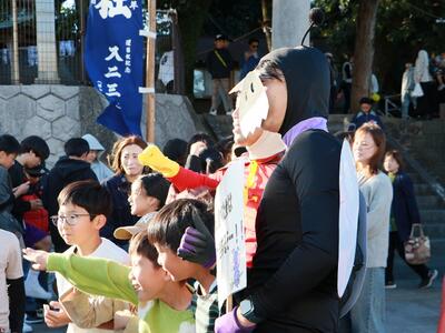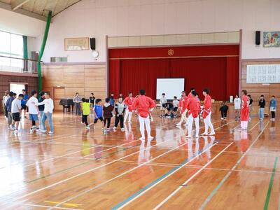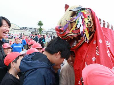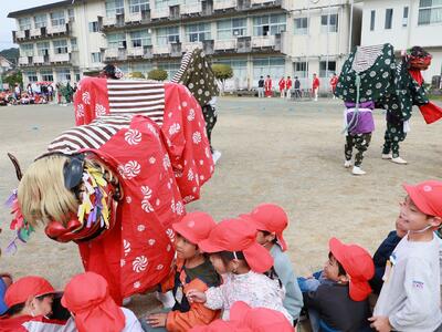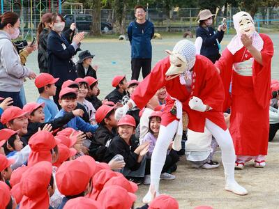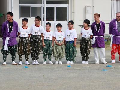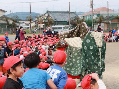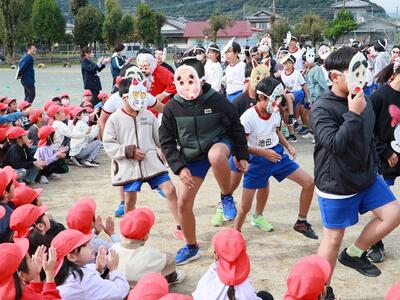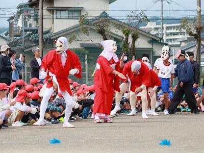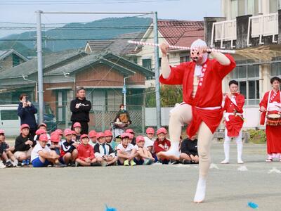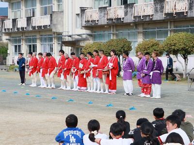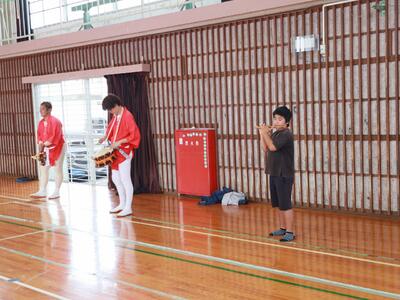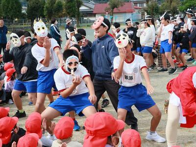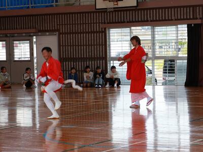 㐂財(きさい)丑寅会の皆さんが、昨日までの疲れも見せず、子どもたちのために「ひょっとこ奉納」がありました。昨日までの祭りの疲れも残っておられる中でしたが、子どもたちのために舞を披露してくれました。6年生も練習の成果があり、上手に舞うことができました。獅子舞もあり、全校で心身の健康を祈りました。tokoとこ事業所から4名の皆さんも見学に来てくださいました。大変盛り上がりました。