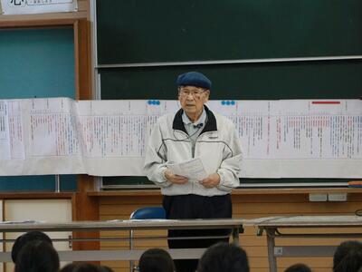 6年生は修学旅行が迫ってきました。旅行先で訪問する知覧特攻平和会館を訪れる前の事前学習として、より戦争と平和、人の尊厳について知るためにお二人の講師をお招きをして平和学習を行いました。講師は、現在、県内中高生を中心に戦争や紛争、そして平和とは何かを考え行動、発信する活動をされている元中学校教諭の仲田彰さんと、日向市戦争の語り部であり、長く沖縄県浦添市との集団疎開に係る交流会を企画・運営されてきた川路にお住まいの甲斐誠二さんでした。また、年1~2回特別展示会を行っている元高校教師で夕刊デイリー新聞にも投稿をされている日向市戦争と平和を考える会の黒木直行さんが、日向市に残る戦争遺品を展示してくださいました。戦争とは、人間の人権と尊厳を奪う最大の差別と侵害です。子どもたちは、社会科の歴史の教科書で学び、そして、体験者と活動される方の話を聞き、修学旅行という学びの場でさらに「自分ごと」にして、未来に向けた平和の在り方を考えてくれることだと思います。戦後80年、財光寺の戦禍の歴史を学べば、戦争は子どもたちにとって身近な人権教育です。※後半3枚の写真は、日向市の戦争と平和を考える会の事務局長だった故・福田鉄文さまより「子どもたちに伝えてください」と許可をいただいたものです。