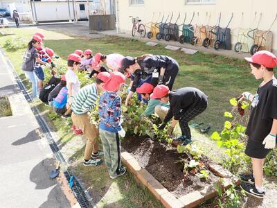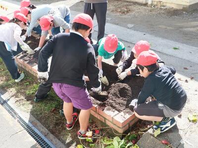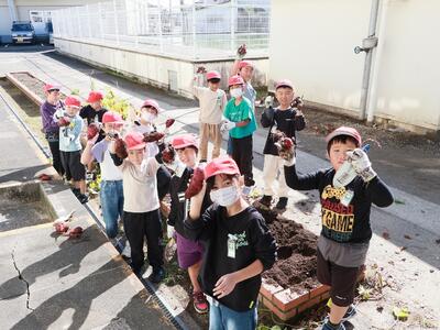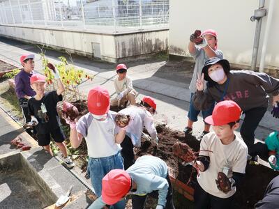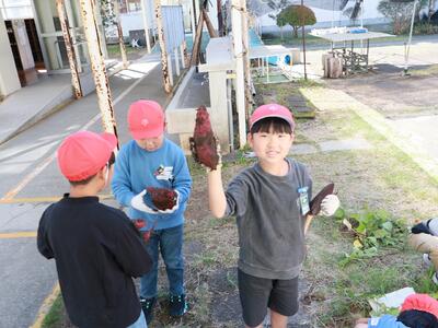 2年生が教室の前で育ててきたお芋の収穫をしました。つるに手こずりながらも目的のお芋に向かってまっしぐら!手のひらサイズから顔の大きさのものまで大収穫でした。お芋を手に取り、とてもよい笑顔でした。さて、このお芋は、何に変身するのかな?
