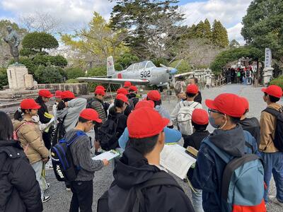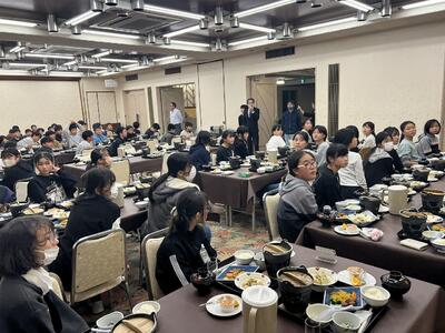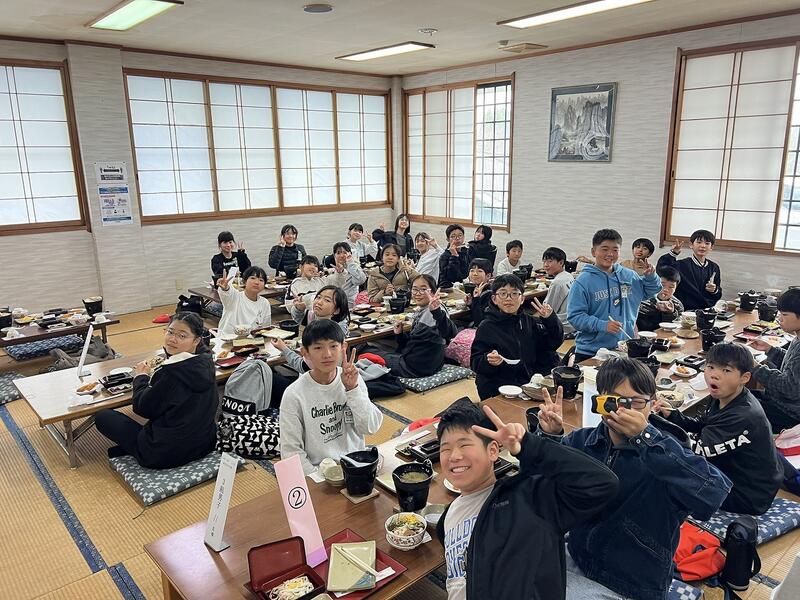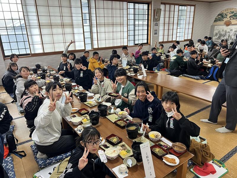 予定通り1日目の昼食場所の「レストイン武家屋敷」に到着して、みんなで楽しく食事をしています。少しバス酔いをした子どもがいたようですが、いつもと違う場所で、みんなと食べる食事は、楽しいものです。笑顔花咲く昼食です。この後、先日、総合的な学習の時間で「戦争と平和を考える」機会がありましたが、鹿児島のことではなく、わが町、財光寺に関係の深い知覧特攻平和会館に向かいます。順調に行程が進んでいます。写真提供:下田先生