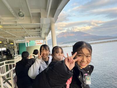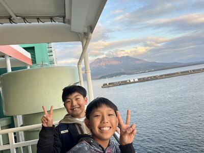 順調にバスの旅が続いているようです。体調の悪い児童もいないようすで、バスの中でも話を聞いたり、おしゃべりをしながら楽しく過ごしているようです。桜島に迎えられ、11時20分頃、昼食予定の「レストイン武家屋敷」に到着予定です。写真提供は下田先生です。