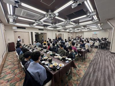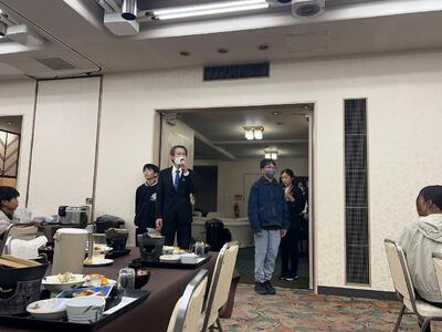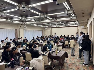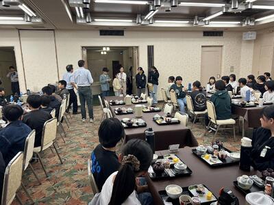 自主研修が終わり、ホテル吹上荘にもどり昼食です。昼食の合間に自主学習で学んだことを報告して全員で共有しています。いよいよ旅行も終わりに近づいてきました。この後、維新ふるさと館の見学です。