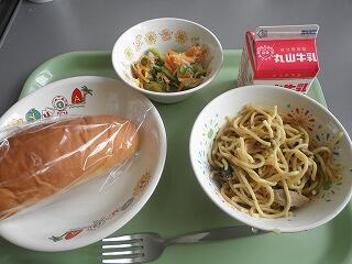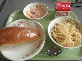 26日の献立 減量ミルクパン 牛乳 ジェノベーゼスパゲッティ コーンスープ