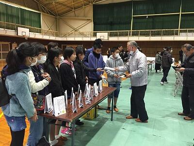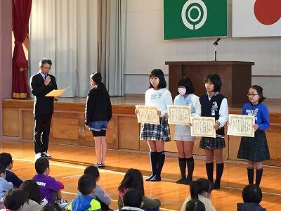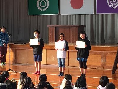 式終了後には、12月25日の「牧水かるた大会」で入賞した児童の表彰式が行われました。取った枚数を聞いた周りの児童から、驚きの声があがっていました。