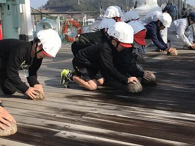 日本には帆船が4隻あります。新旧日本丸、新旧海王丸です。今回は、新海王丸での学習でした。船では、デッキ磨きやロープワーク、機関室でのエンジン操作等を体験させて頂きました。滅多にない機会であり、子ども達は、いつにも増してやる気満々で取り組めました。
