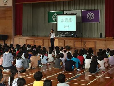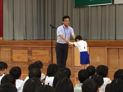 終業式では、まずはじめに校長先生が地域の方からのメッセージを紹介してくださいました。財っ子たちのやさしい行いをよく見て下さっているものが多くありました。その後、2年生と4年生の代表児童が1学期がんばったことを上手に発表しました。