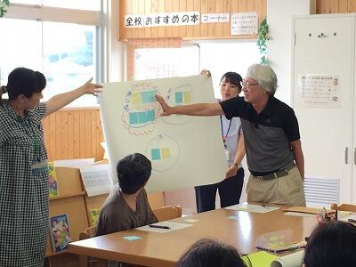地域からは、区長さん、民生委員さん、スポーツ少年団指導者の方、読み聞かせの会の方、農業小学校校長先生、サーフィン連盟理事長さんなどなど、いろいろな立場の方々17名のご参加をいただき、保護者、教職員をあわせて総勢42名で、「財光寺で子どもたちがどう育ってほしいか」「地域・学校の”困りごと”とその解決に向けてのアイデア」をテーマに、それぞれの思いを”おしゃべり”することができました。