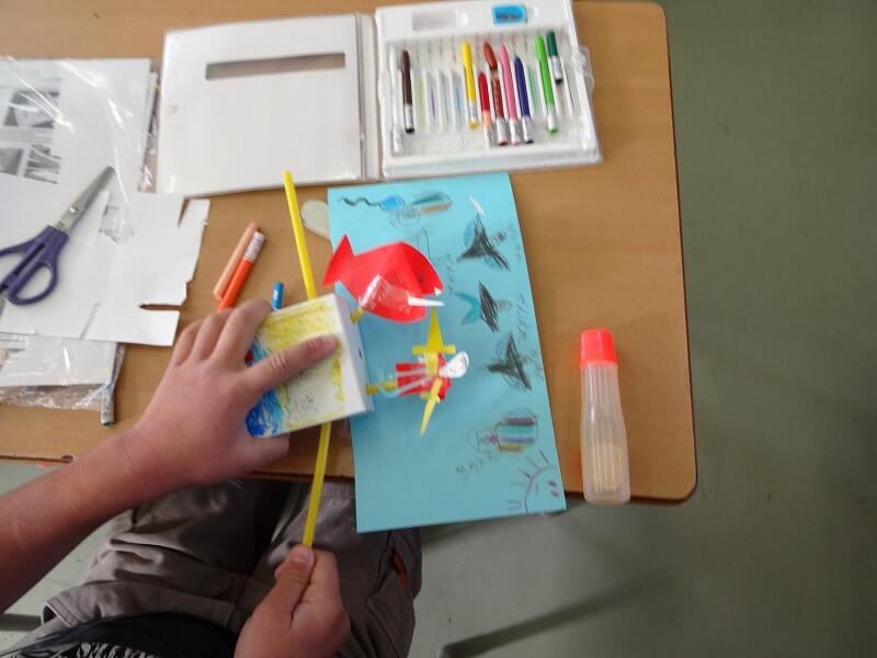 2年生の図工では、ストローを使った作品「ストローピョコパタ」を作っています。