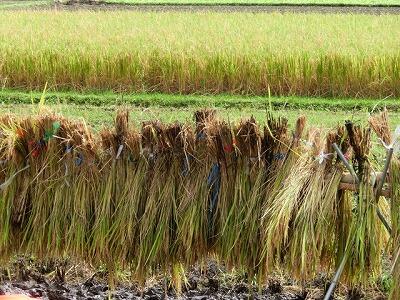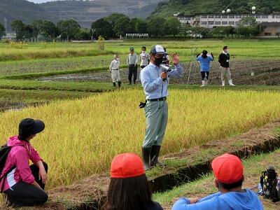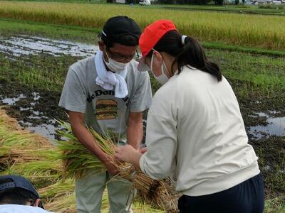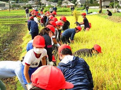 10月13日(水)に5年生は、稲刈りをしました。前日までの雨の影響でぬかるんでいる中ではありましたが、よい天気の中実施することができました。治田健吾さんにかまの使い方を教えてもらい、少しずつ上手に刈ることができました。稲を結ぶのは難しそうでしたが、二人一組で協力しながら刈った稲を結ぶことができました。今回も地域の方や保護者の方に協力してもらい、無事に終えることができました。次は脱穀を頑張ります!