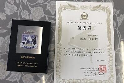8月に行われた、2021年度ピティナピアノコンペティション九州地区本選D級において、本校5年生の黒木優太さんが見事に優秀賞を受賞しました。このコンテストは、各地区のトップレベルの方が予選を突破して出場する大変レベルの高いものです。さらに優太さんは、今回、自身の小学生クラスを飛び越して中学生クラスのD級にチャレンジ。中学生と競い合い、もう少しで全国大会という上位の成績を収めました。「来年もこのクラスで挑戦し全国へ!」と語るときの表情はキリッと引き締まり力強かったです。毎日5時間以上の自主練習を重ねたという優太さん。夢に向かって「本気」でがんばる優太さんをこれからも応援しています。