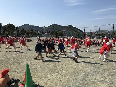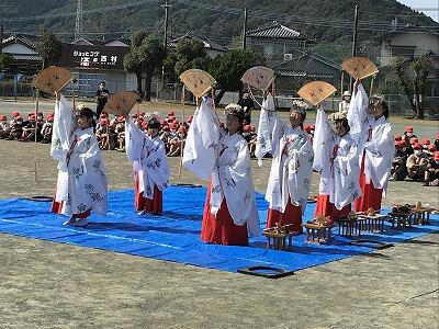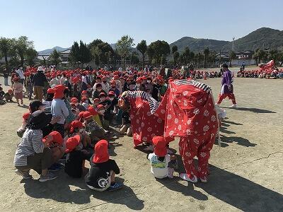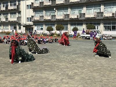 11月2日()、本校にて地域の「酉戌炎舞会(ゆうじゅつえんぶかい)」によるひょっとこ奉納と、小中学生を中心とした浦安の舞、獅子舞が行われました。ご存知の通り、五十猛神社秋季例大祭に伴い60年以上続く伝統行事です。