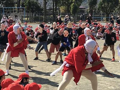 今年は天気がよかったため、運動場で披露してもらいましたが、その迫力と面白さに子供達も職員も大興奮でした。本校児童13名も浦安の舞と子獅子を見事に舞ってくれました。ひょっとこ躍りは切れがよく、リズムに合わせて見事な踊りを披露してくださいました。これには、数名の6年生も参加し、自作のお面をかぶって一緒に練り歩きました。きっとこれから、ひょっとこ踊りを継承してくれることでしょう。