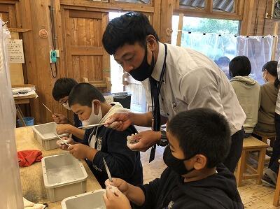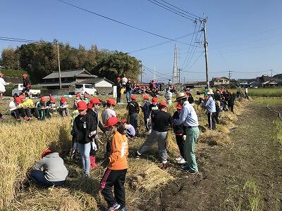 5年生は、10月30日(金)に脱穀をしました。実習田に到着したら、まず地域の方に脱穀の仕方や手順を教わりました。そして、さっそく作業に取りかかり、みんなで協力して脱穀の作業をしました。干してある稲を運ぶ児童、稲を干すための竹等を運ぶ児童、落ちた稲を一本一本拾う児童などなど、それぞれの活動に一生懸命取り組みました。結果、7袋のもみつきのお米ができました。児童は、もみつきの米の匂いをかいだり、一袋の米を持って重さを実感したりと、貴重な体験をしました。次は、いよいよ精米となります。できあがった米を見るのが楽しみです。