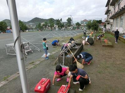 台風12号の接近で当日の朝6:00まで実施の判断を先延ばしにしました。別日を設けていなかったので、運動会前の作業ができるか大変心配していたところです。幸いにも、作業の時間帯は雨に見舞われることなく、風の影響もなく、直接日差しを受けることもなく草刈りや草集め、草抜きができました。おかげさまで、よいコンディションで運動会当日が迎えられそうです。