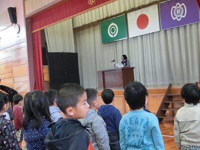 修了式では、校長先生から1年生~5年生の代表児童に修了証の授与がありました。その後のあいさつの中で、「やりたいこと できることが増え、やらなければならないことが確実に定着し、みんなが伸びる学校」を目指すという目標が達成できたかどうかというお話があり、3学期の子どもたちのがんばりの様子を通知表の所見を通して、各学年分を紹介されました。