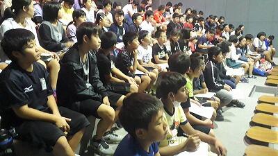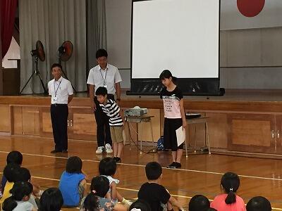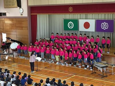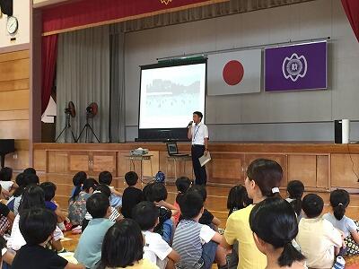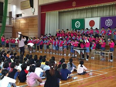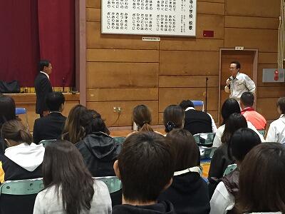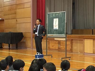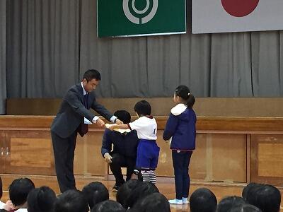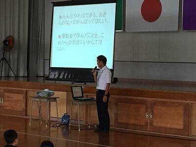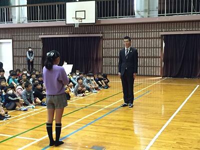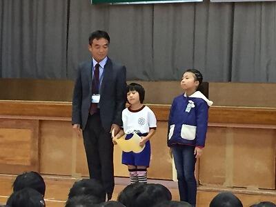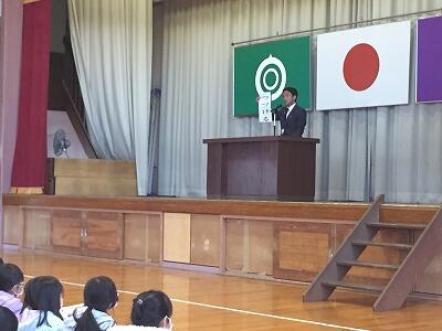 まず4年生、1年生の転入生2人の紹介のあと、校長先生から、昨年ノーベル賞を受賞された吉野彰さんの子どもたちへのメッセージをもとに「自分たちのすきなこと、興味のあることを見付けて、夢や目標をもってあきめずに努力すること」についてのお話がありました。