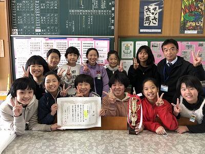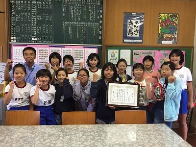 そのあと、県文集「ともだち」入賞者の表彰を行いました。作文掲載、氏名掲載、挿絵掲載それぞれで本校のたくさんの児童が入選し、名前を呼ばれました。代表で6年生が表彰状を受け取りました。