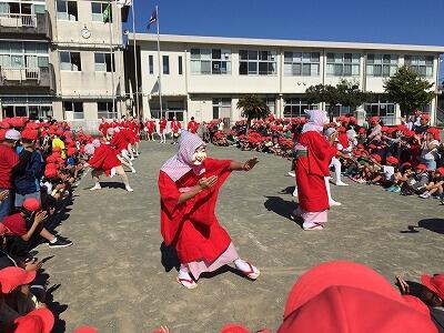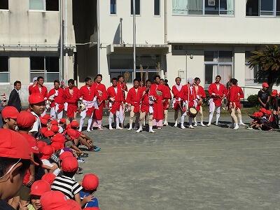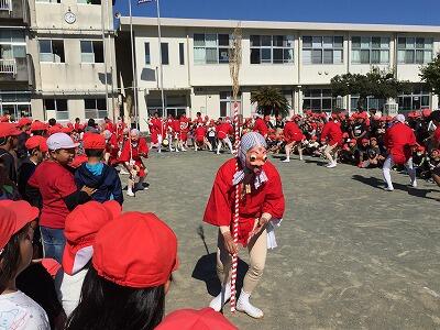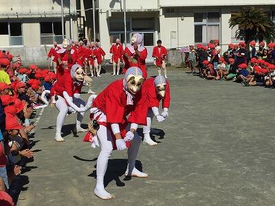 11月5日、五十猛神社大祭の余韻が残る火曜日の昼休み時間、羊申舞会(ようえんぶかい)の方々が来校され、ひょっとこ踊りを披露していただきました。本校児童の保護者の方々も多数おられて、子どもたちは太鼓や鉦の音に合わせて、かけ声や手拍子とともに盛り上がっていました。地域の伝統を間近に見ることができる財光寺小の子どもたちは幸せです。羊申舞会(ようえんぶかい)の皆様、ありがとうございました。