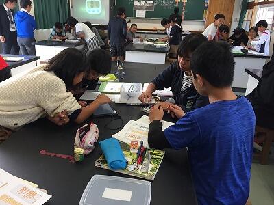 11月7日(木)5校時、日向市教育研究所の先生方が取り組んでいるプログラミング教育の研究授業が6年1組で行われました。「発電と電気の利用」の単元の中で、電気を効率的に使うためのプログラミングの仕方について6年生がグループごとに協力して考えました。タブレットPCと実験器具をつなぎ、自分たちで考えたプログラム構成を試しながら、明かりの付き具合を確かめる子どもたち、意欲的に熱心に取り組んでいる姿が印象的でした。