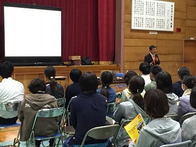 11月7日(木)19:30から本校体育館において、PTA教養部主催の講演会が行われました。今回は、講師に『日本ほめる達人協会』の小澤充寛さんをお招きして、ほめることの大切さ、すばらしさ、そしてほめ方について、わかりやすく教えていただきました。参加している保護者の方も終始笑顔で、楽しい雰囲気の中、とてもためになるお話をたくさん聞くことができました。