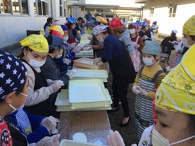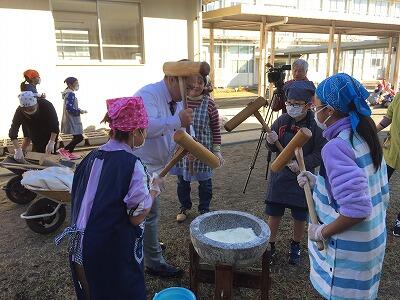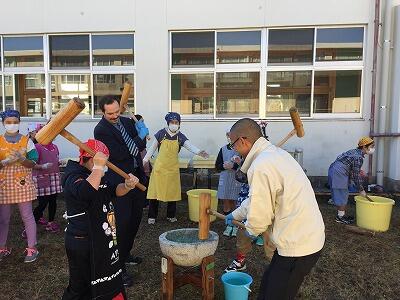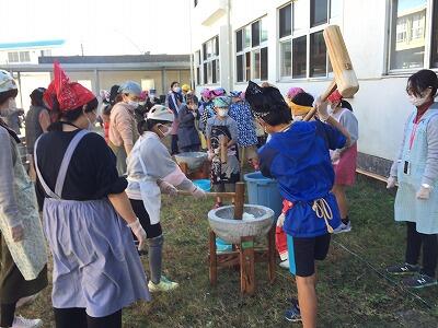 11月29日(金)、5年生が一連の米作り活動のフィナーレとして、もちつき、団子づくりに挑戦しいました。今年もこの活動に『日吉だんご』の日吉社長ご夫妻においでいただきました。1校時は日吉社長のお話を聞いて、「何事もあきらめずに最後までがんばること」の大切さについて考えた5年生。2校時からはもちつき、団子づくりに取り組みました。日吉だんごさんのサポートで、あん入り、よもぎ入り、芋入りなどおいしい団子がたくさんできました。この活動には、たくさんの5年生の保護者の方、おばあちゃん方もお手伝いいただき、本当にありがたかったです。”収穫の喜び”をいっぱい味わうことができた1日でした。