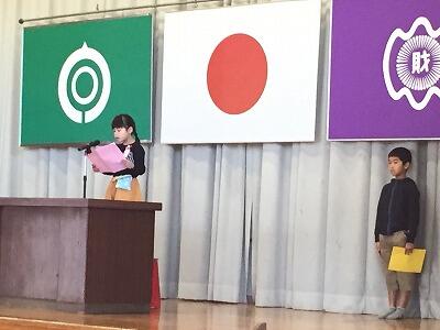 その後、3年生と1年生の代表児童が作文発表を行いました。2人とも「がんばってできるようになった」ことを堂々と発表しました。どちらも内容、態度ともにすばらしい発表でした。