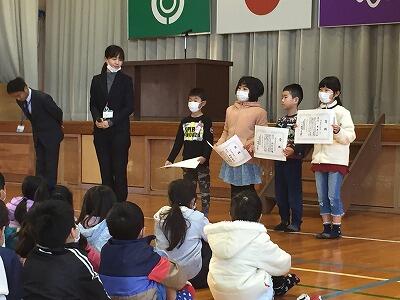その後、12月に行われた牧水かるた大会個人の部で4位入賞(96枚、すごいですね!)した6年生の表彰と各校務部の隊長の先生方から「立腰の大切さ、インフルエンザ予防」「1分前着席・黙想、午後8時のメディアスリープ、10分間家読への取組」「休まず登校、元気な返事」についてのお話がありました。