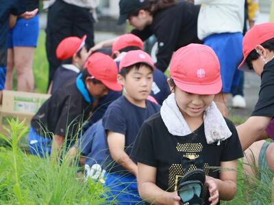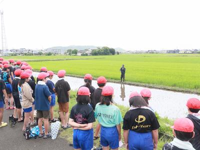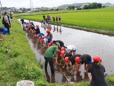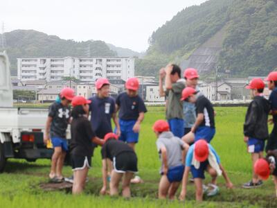 5年生3クラス合同で田植えを行いました。田んぼに出発する時は、小雨でしたが、田植えが始まる頃には雨も止み、田植え日和となりました。指導者の治田さんのお話を聞き、いいよ苗の植え付けが始まりました。いろんな歓声があがりましたが、一つ一つ丁寧に植え付けていくことができました。協力いただいた治田さんをはじめ、JA日向青年部の皆さんにも感謝申し上げます。また、応援にきていただいた保護者の方ありがとうございました。さあ~これからの苗の成長が楽しみです。