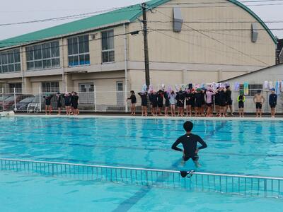 プール開き初日は、雨が強くできない学年が多かったのですが、6年生が短い時間でしたが、入水しました。気温と水温を足して40℃を超えることや天候などの条件を考えながら、しっかり学習のルールを守らせながら安全に取り組ませたいと思います。