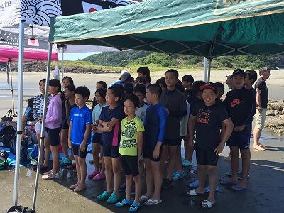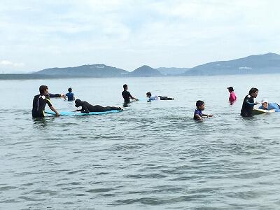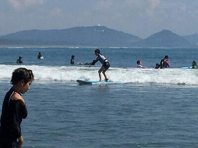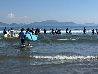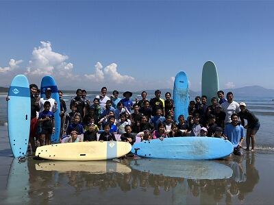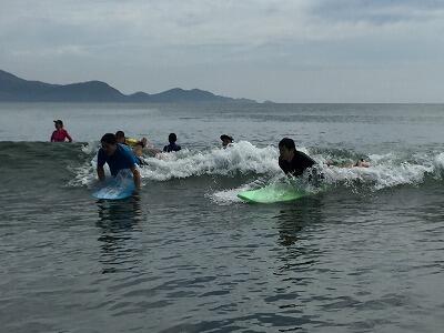 キャリア教育研修として、1つのグループは日向市サーフィン連盟の方々のご指導の下、お倉ヶ浜ビーチで「サーフィン体験」に挑戦しました。