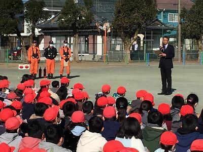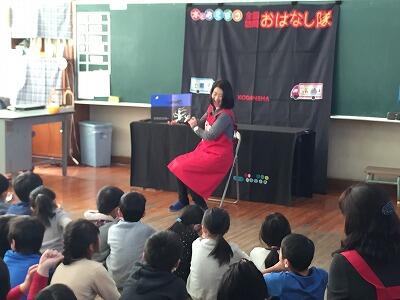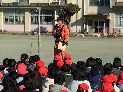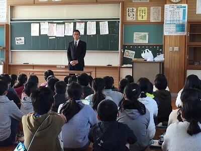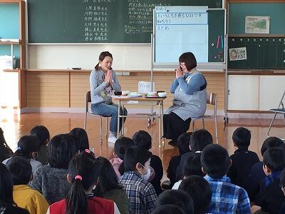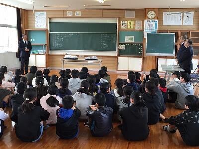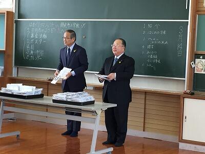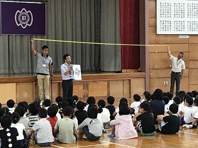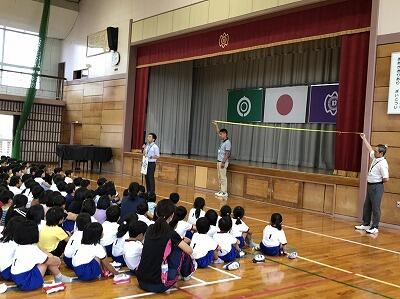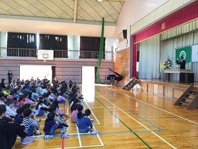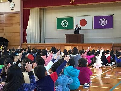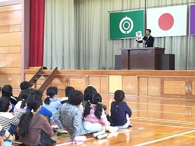 はじめに、校長先生からはリボンとテープで「100歳まで生きる」をイメージしながら、「命を大切にすること」についてお話がありました。その後、「歯と口の健康ポスターコンクール」で教育長賞を受賞した1年生の表彰とむし歯予防、横断歩道の渡り方について、担当の先生からお話がありました。